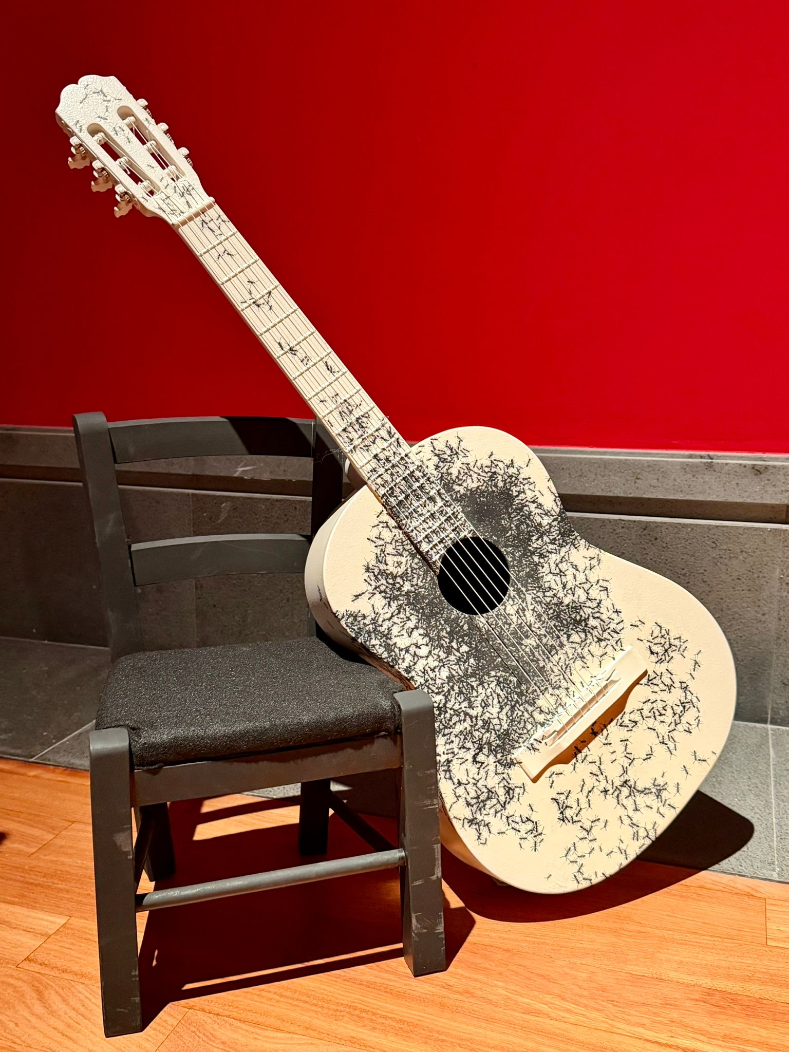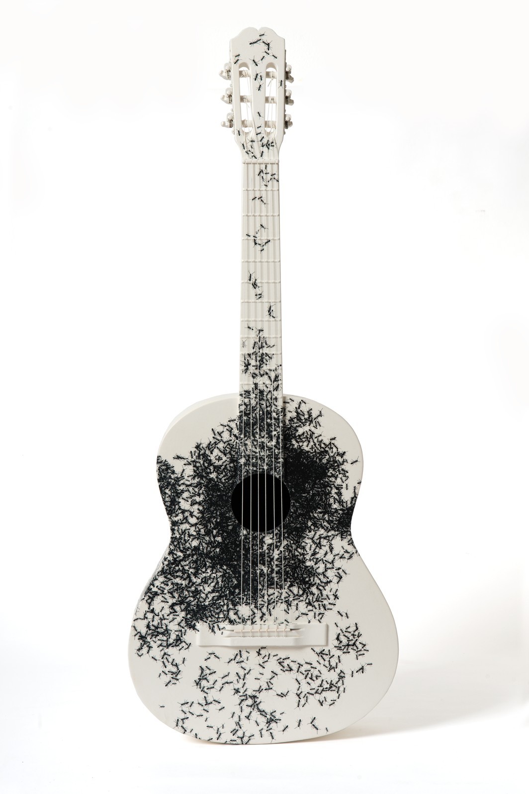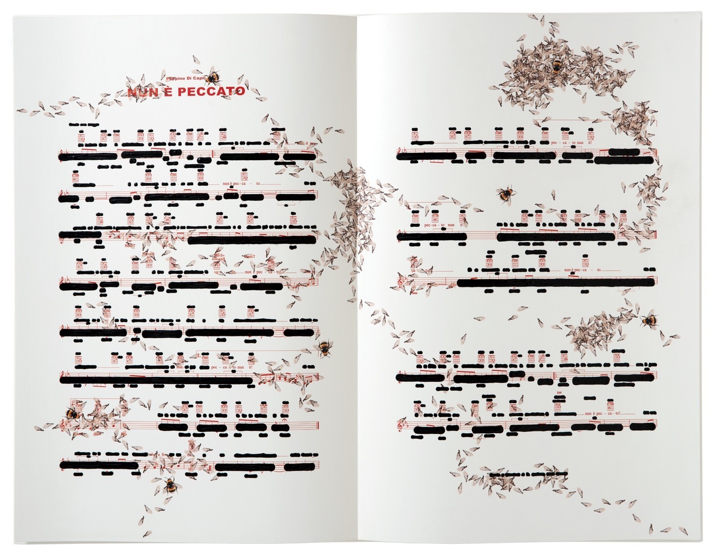 Accanto alle scritture musicali riarrangiate da Isgrò, trovano posto tre lavori a tutto tondo: due mandolini e una chitarra classica a dimensione reale, attraversati dagli stessi insetti che popolano le opere bidimensionali.