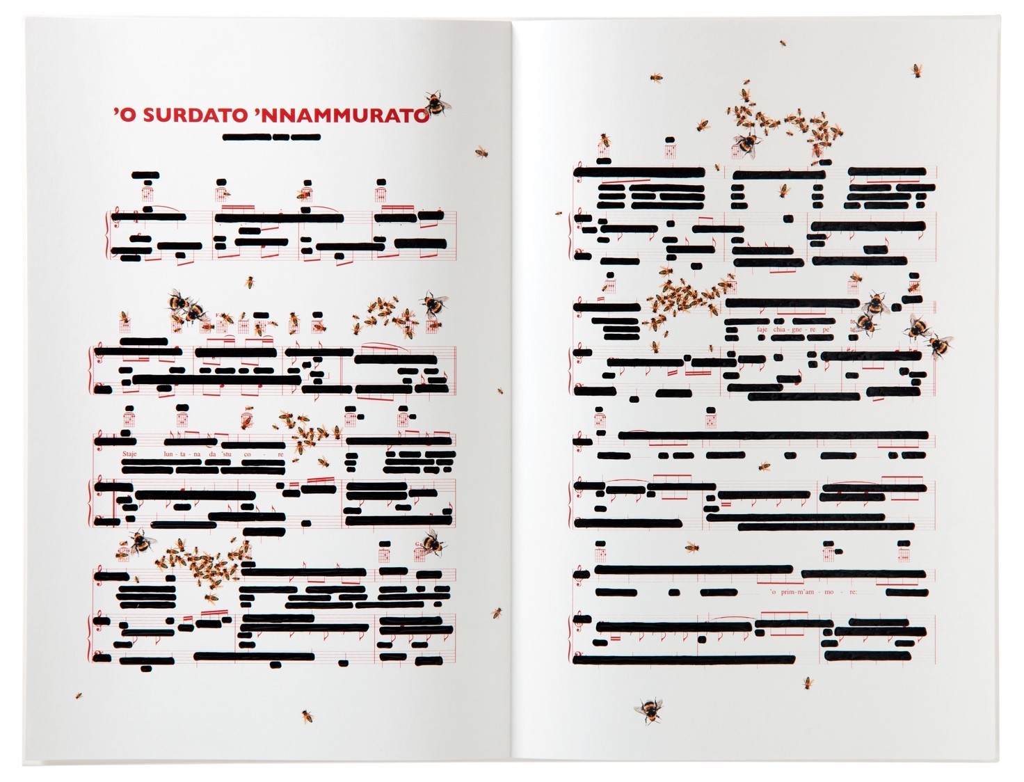 “Le api e le formiche musicali di Isgrò sono emanazioni della mente dell’artista – nota Eike Schmidt nel suo saggio curatoriale - segni non pittografici, privi di denotazioni semantiche precise; metasegni senza funzione grammaticale; ipersegni di connotazioni molteplici e reciprocamente contradditorie, come del resto le cancellature stesse. Se però le cancellature evidenziano e celano il testo nello stesso tempo, coprendo le parole per proteggerle e conservarle, le processioni e i grovigli degli insetti introducono sulla superficie della carta, un elemento dinamico. La loro coreografia collettiva rende evidente la dimensione sociale della canzone e, in qualche caso, sembra persino interpretarne il carattere: si pensi ai grandi grumi brulicanti sullo spartito della Tammurriata nera”.