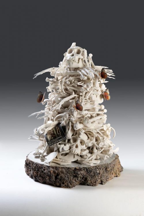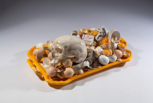Paolo: Negli anni Duemila cercavamo di entrare nel mondo dell’arte contemporanea e provammo a metterci in contatto con il gallerista Gian Enzo Sperone. L’occasione arrivò quando realizzammo in ceramica un’opera derivata da un dipinto di Jan Knap, su proposta della Galleria Carini. Sperone l’acquistò e volle incontrarci di persona. Questa fu l’occasione per chiedergli di darci una chance e di organizzare una mostra personale. In un anno portammo avanti un lavoro intenso, tra cui l’opera Scegli il Paradiso, una grande zolla idealmente proveniente dal Paradiso su cui la Madonna è intenta a tagliare un prato di tulipani. Lavorammo parallelamente su altre opere, come gli accumuli di ossa e di stoviglie e queste parvero a Sperone particolarmente adatte al mercato dell’arte. La mostra si tenne alla Galleria 1.000 Eventi di Milano (7). Maturammo in quegli anni la decisione di cambiare le tecniche fino ad allora usate, includendo nuovi materiali di derivazione industriale, come la fotoceramica, per ottenere risultati formali più interessanti. Abbandonammo quasi del tutto il pennello e la maiolica perché avevamo bisogno di maggiore oggettività, volevamo raffreddare il segno affinché il lavoro fosse riconosciuto come Bertozzi & Casoni, come marchio. Fin dalla nascita del marchio, nel 1980, desideravamo che le differenze individuali non fossero immediatamente percepibili e che la mano singola non emergesse. È stato un passaggio fondamentale, frutto di una scelta concettuale per costruire uno stile oggettivo e riconoscibile, una poetica condivisa che ci permette, ancora oggi, di proseguire come Bertozzi & Casoni, anche dopo la scomparsa di Stefano.