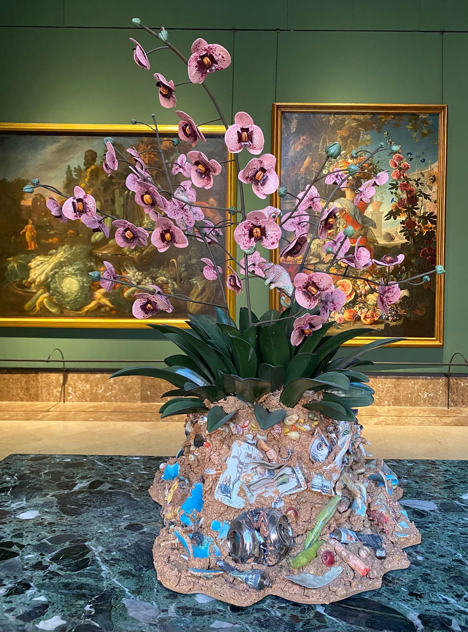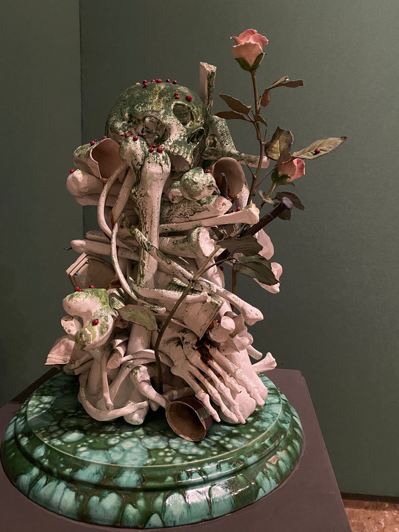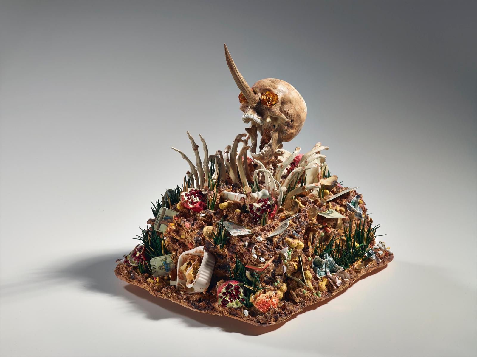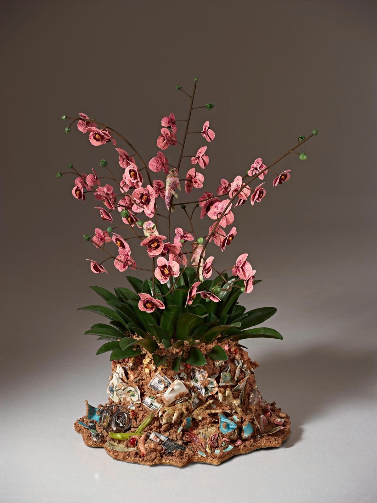 Le traiettorie imprevedibili percorse da Bertozzi & Casoni nell’ambito della loro ricerca, si manifestano in lavori come Sparecchiatura (2025), in Grand Hotel (2025), e Vassoio (2005), colmi di materiali eterogenei, nelle zolle di terra sature di scarti come in Disgrazia con orchidea rosa (2012) e la grande installazione Madonna scheletrita (2008) posta al centro della sala 37.