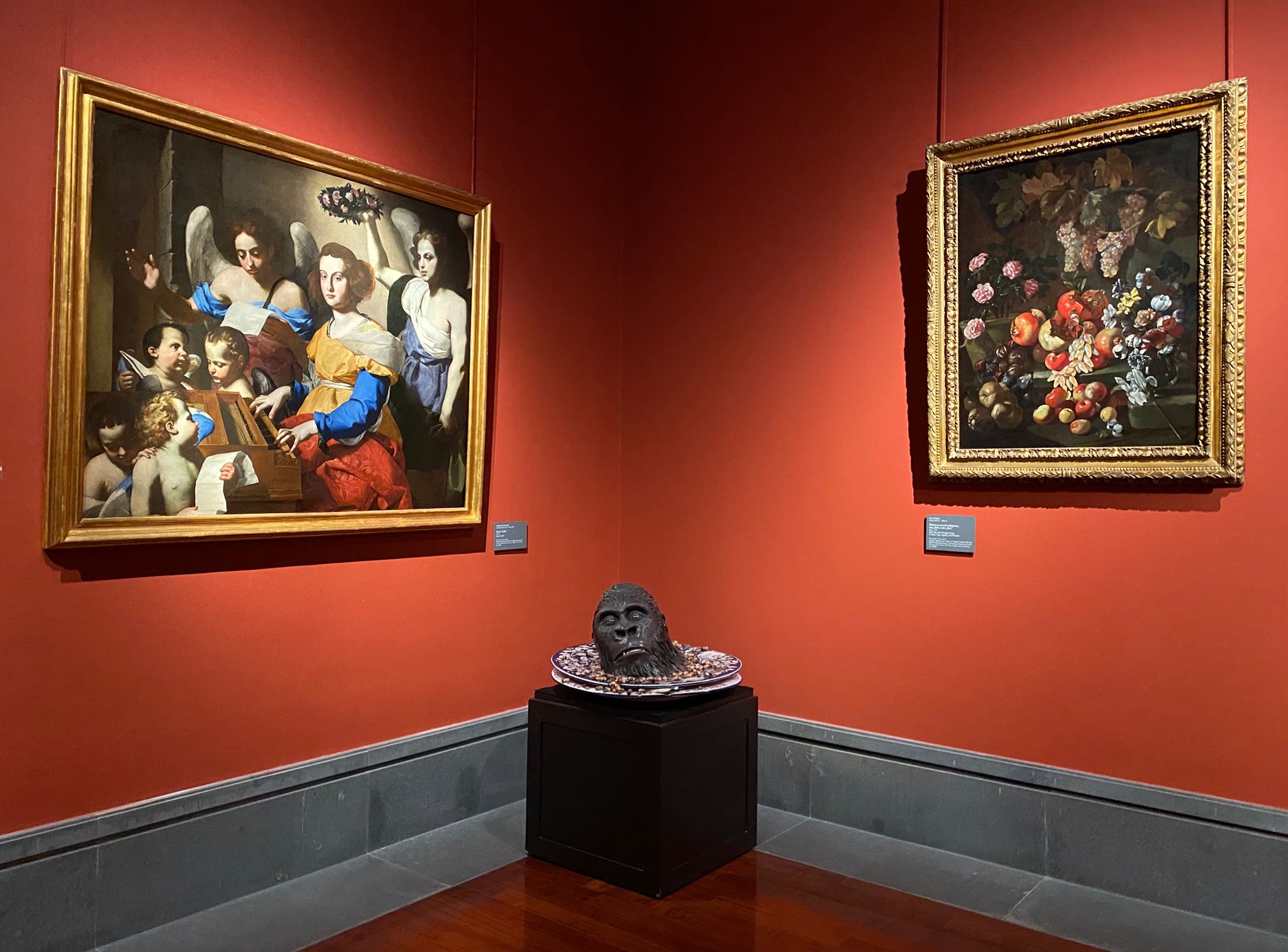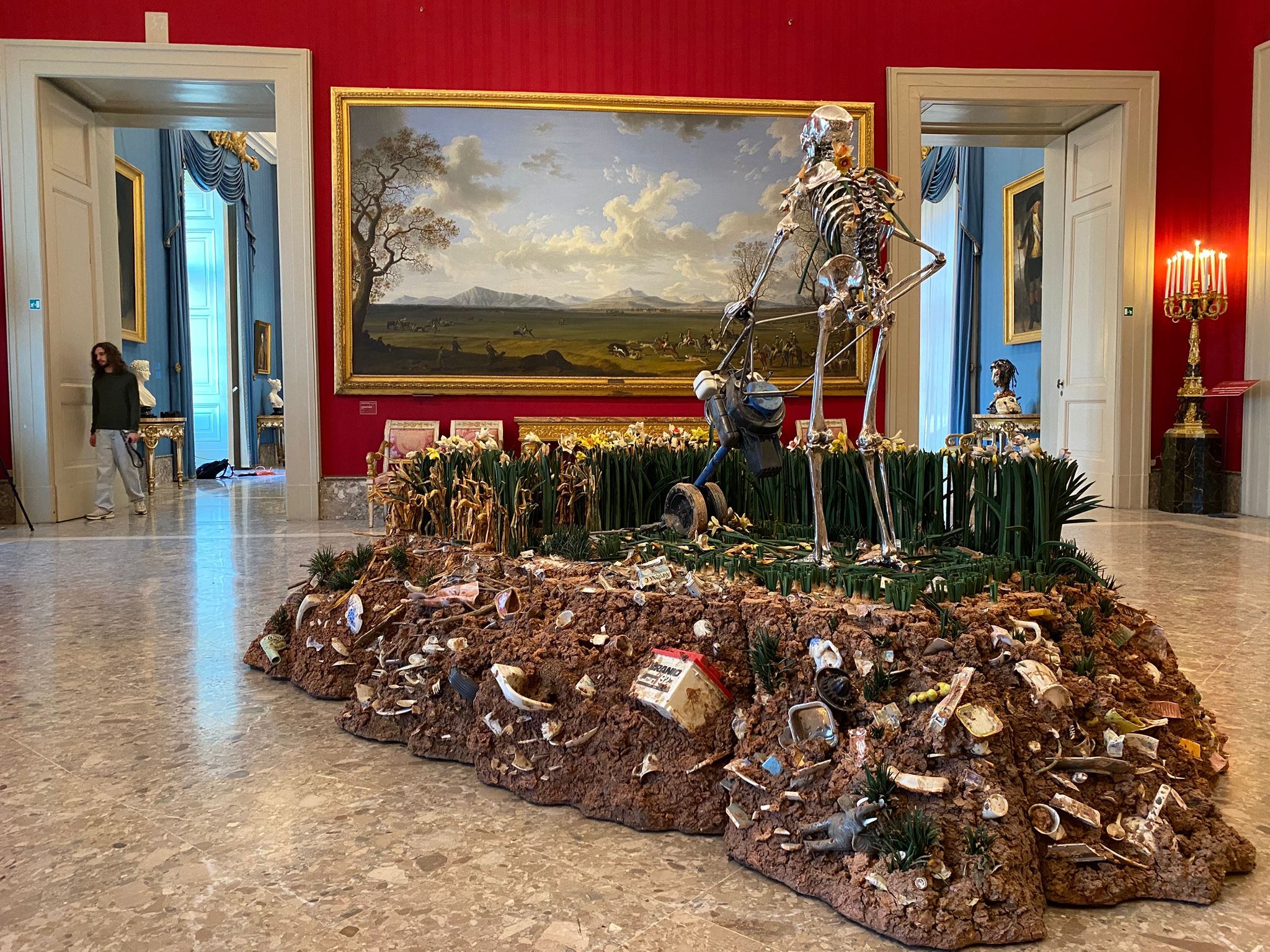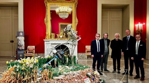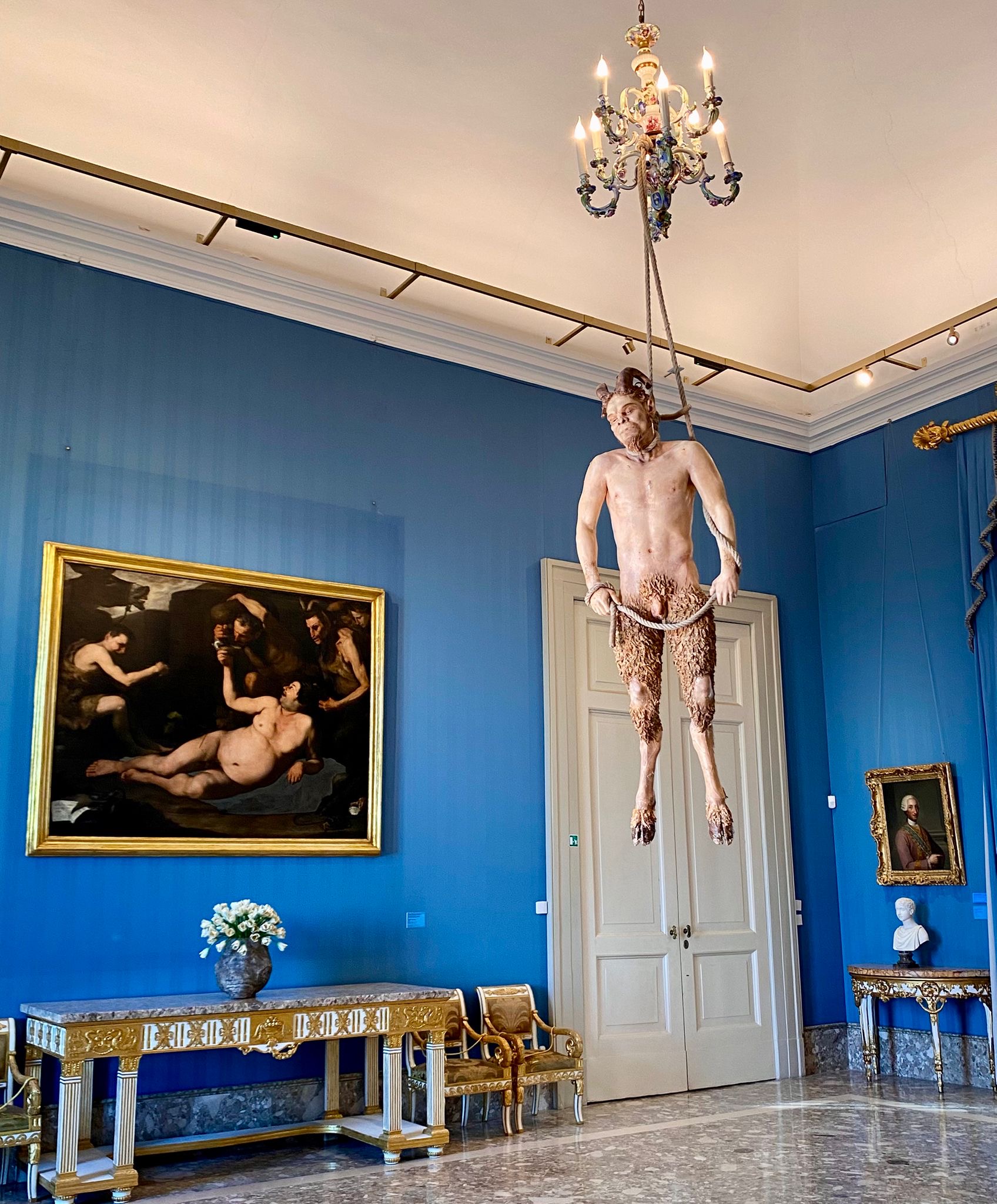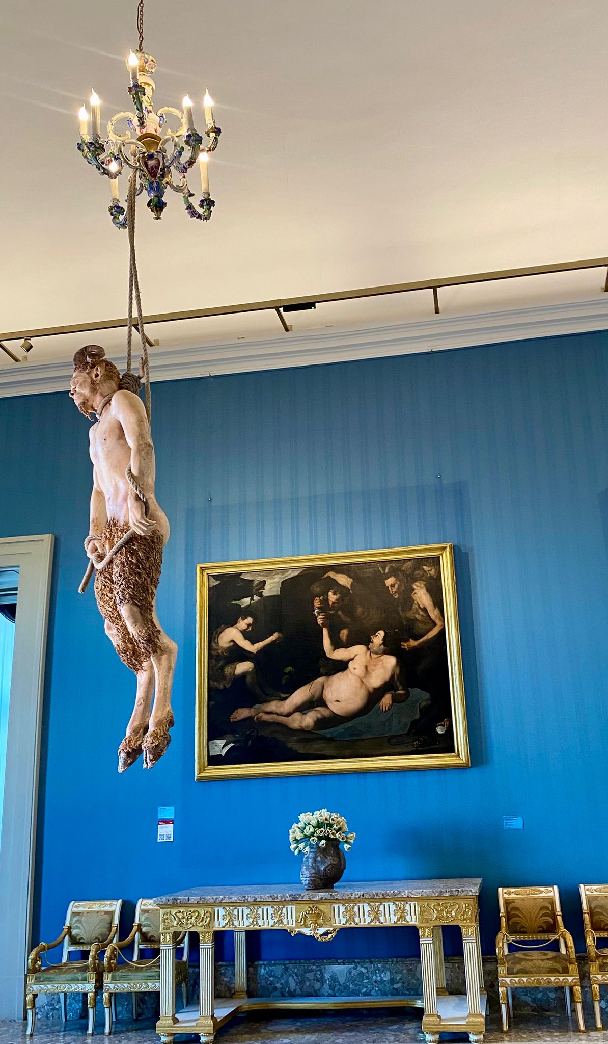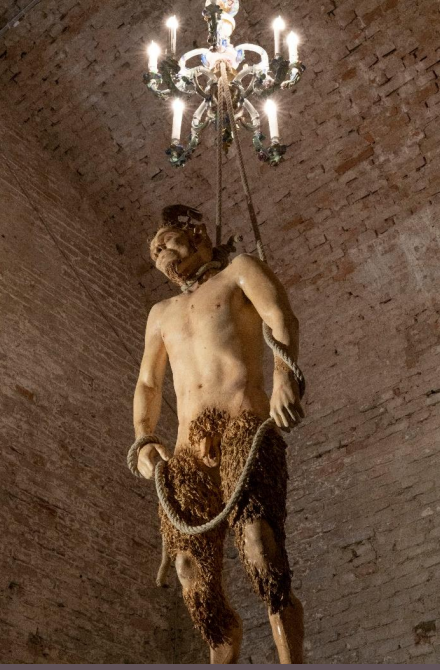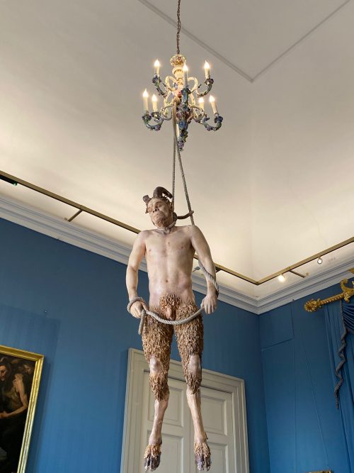 Tra le opere esposte, nella sala 34, figura la scenografica installazione La morte dell’Eros (2000-2023), raffigurante un fauno di grandi dimensioni sospeso al soffitto, che evoca la tradizione classica ampiamente rappresentata nelle collezioni storiche del Museo.