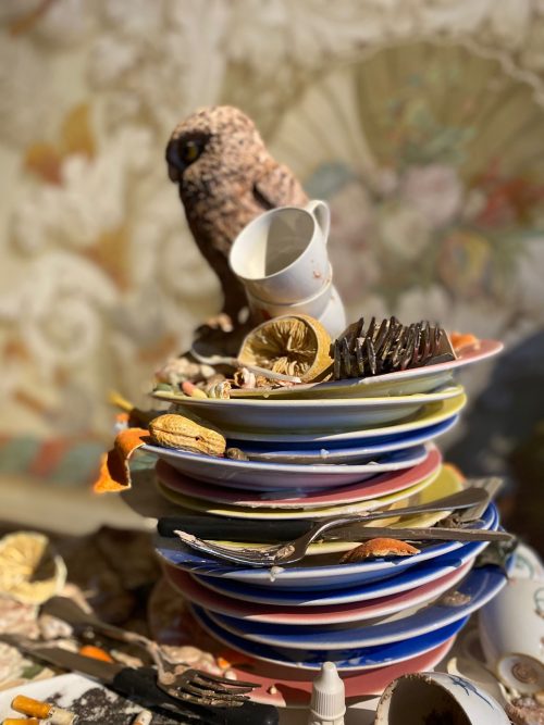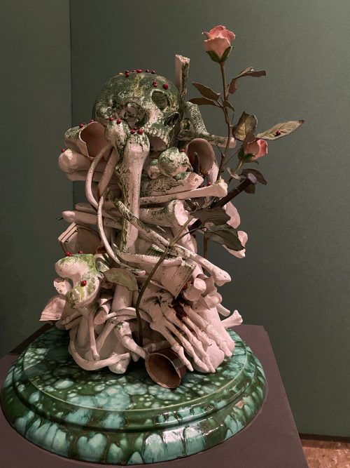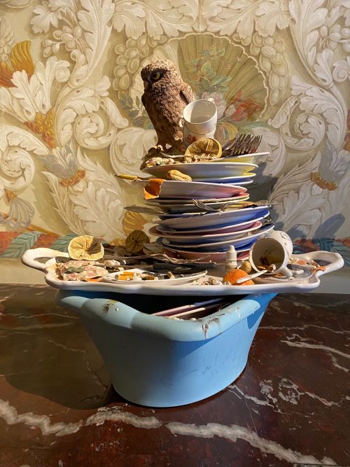 Claudia: Non è la prima volta che le opere di Bertozzi & Casoni vengono esposte in contesti storici, e mi sembra che in questi luoghi si inseriscano con naturalezza, agendo armoniosamente per accumulo e sovrapposizione, al contrario di quanto accade nel white cube di una galleria, dove pure hanno spesso esposto, dove agiscono per contrasto. Credo che la caratteristica più evidente sia il fatto di poterle considerare opere “aperte” (9), con più livelli di lettura, aspetto sottolineato anche nei titoli delle loro mostre e opere nei quali è ricorrente l’avverbio «forse». Sono lavori che insinuano il dubbio, si propongono in maniera ironica e destabilizzante, presentando accostamenti sorprendenti. In questo senso le opere sono permeabili e possono accogliere suggestioni, trovare sorellanze con opere di altri secoli o di altri contesti.