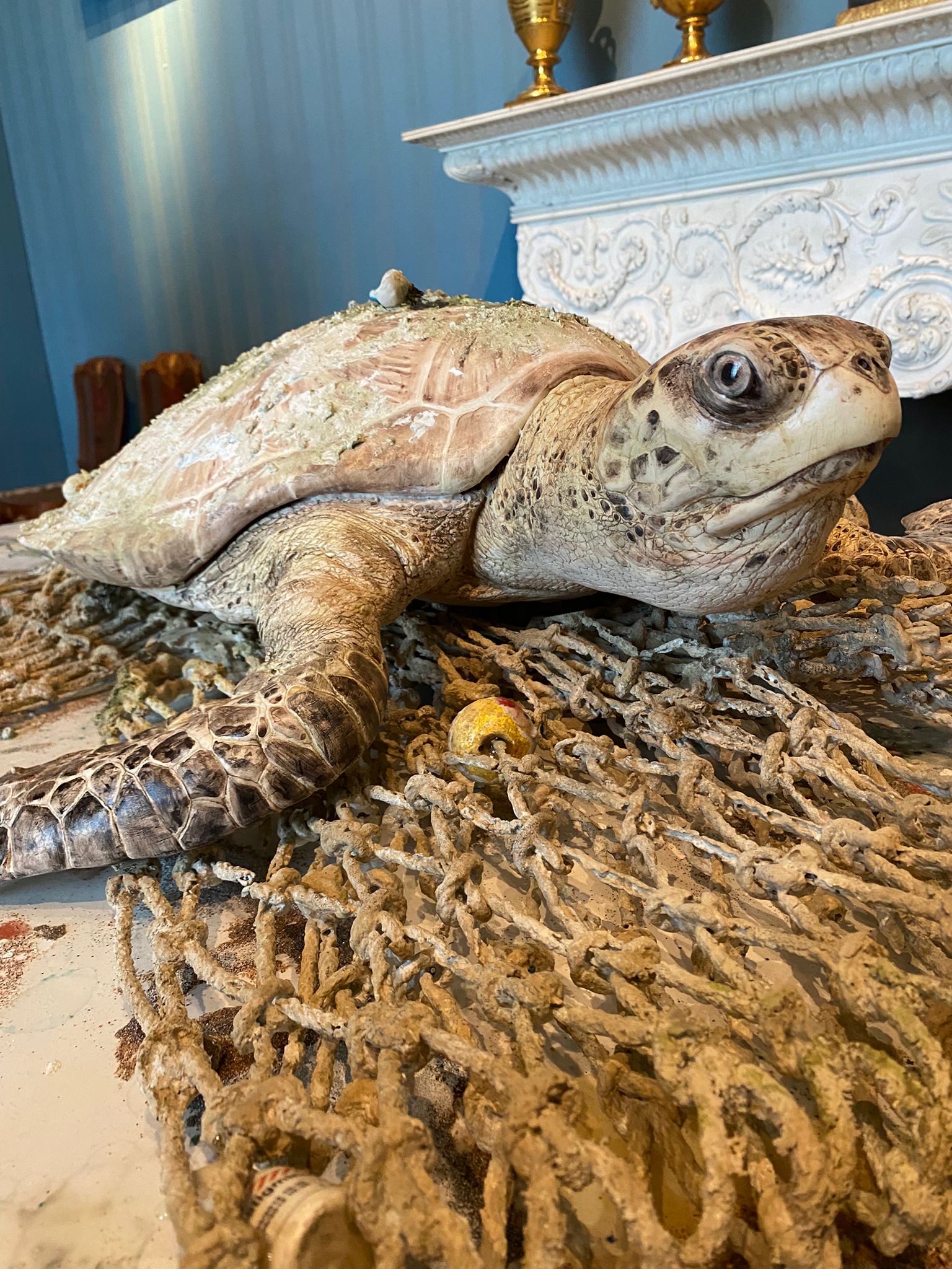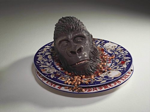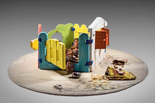 Il risultato è un iperrealismo esasperato, attraversato da accenti surreali e da una potente vena ironica, come nell’opera Chicco House (2005), allestita al centro del pavimento della Sala della Culla. Qui la casetta giocattolo dai colori vivaci, abitata da scimmiette irrequiete e circondata da resti di cibo e oggetti come il pacchetto di sigarette, crea un cortocircuito visivo, mescolando innocenza infantile e allusioni al mondo adulto.