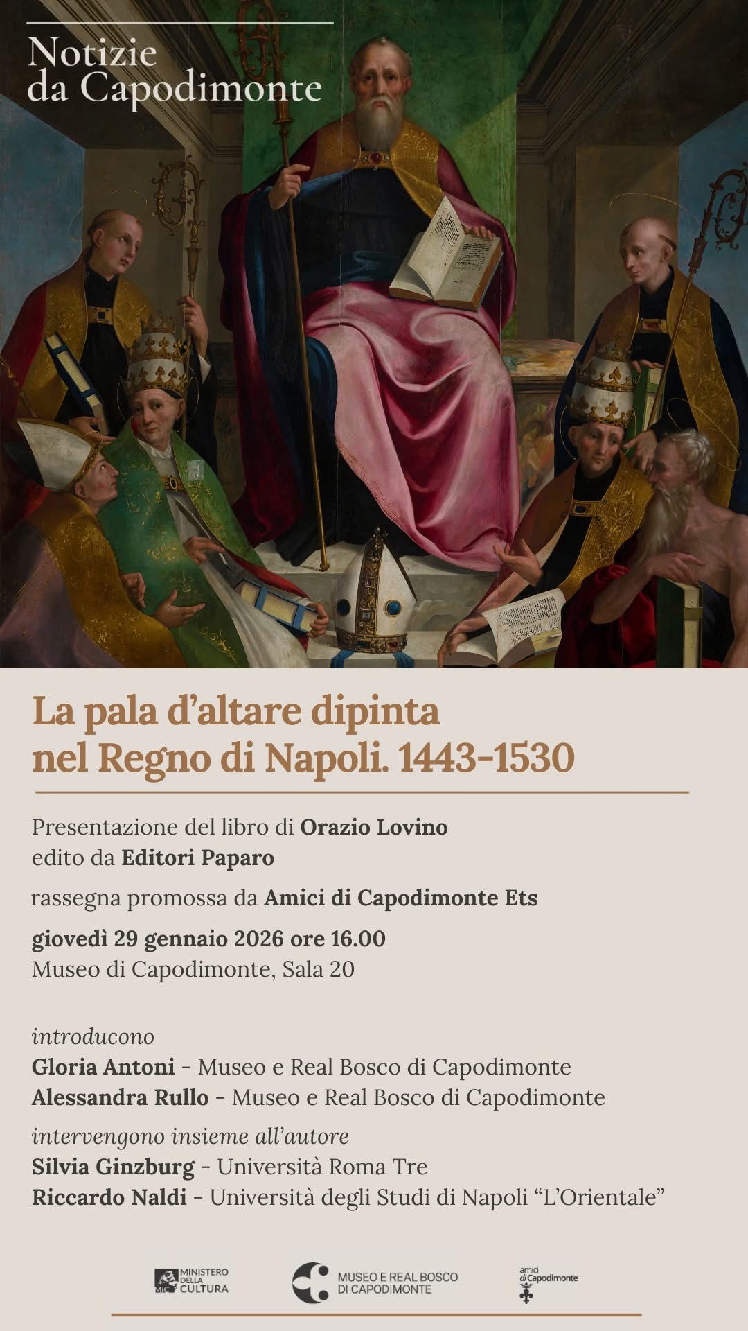 Nell’ambito del ciclo di incontri Notizie da Capodimonte, promosso e curato da Amici di Capodimonte Ets, viene presentato al Museo e Real Bosco di Capodimonte il libro La pala d’altare dipinta nel Regno di Napoli. 1443-1530 (Editori Paparo 2025), frutto della tesi di dottorato di ricerca di Orazio Lovino.