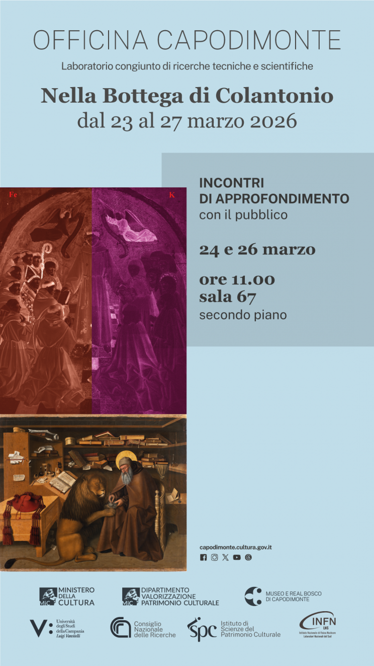 “Officina Capodimonte– dichiara il Direttore del Museo e Real Bosco di Capodimonte, Eike Schmidt – porta la ricerca nel cuore del Museo, di fronte all’opera, per entrare nel vivo della tecnica artistica. Un racconto che comincia da Colantonio proprio per sottolineare l’importanza della pittura meridionale del ‘400 e in particolare di questo caposcuola. Proseguiremo sempre in parallelo tra indagini in laboratorio e occasioni di apertura al pubblico, per condividere un sapere profondo e stratificato che diventa divulgazione accessibile.”