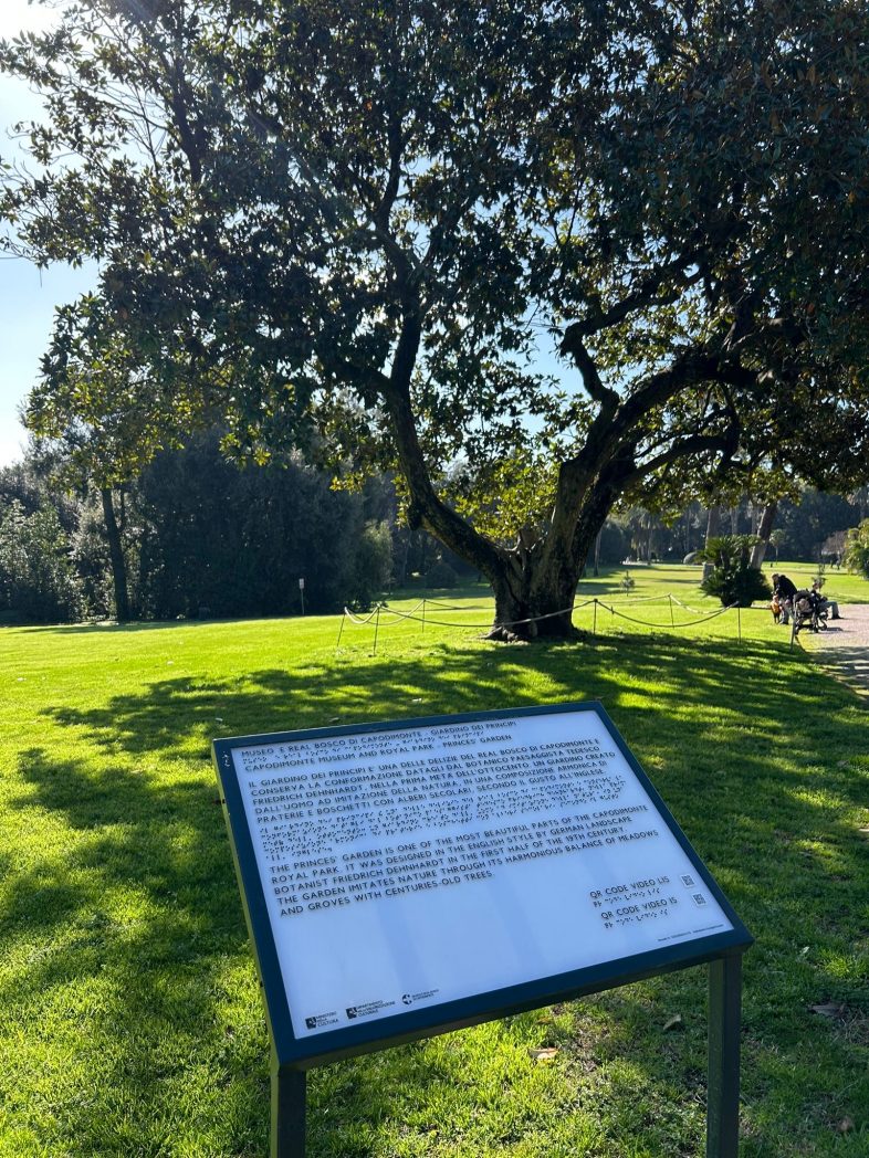 I pannelli sono stati studiati per orientare i visitatori – anche con deficit percettivi – sui punti di interesse dei 134 ettari di Real Bosco oltre a fornire un’introduzione sul valore storico e paesaggistico del giardino più prossimo al museo, ovvero il Giardino dei Principi recentemente restaurato.
