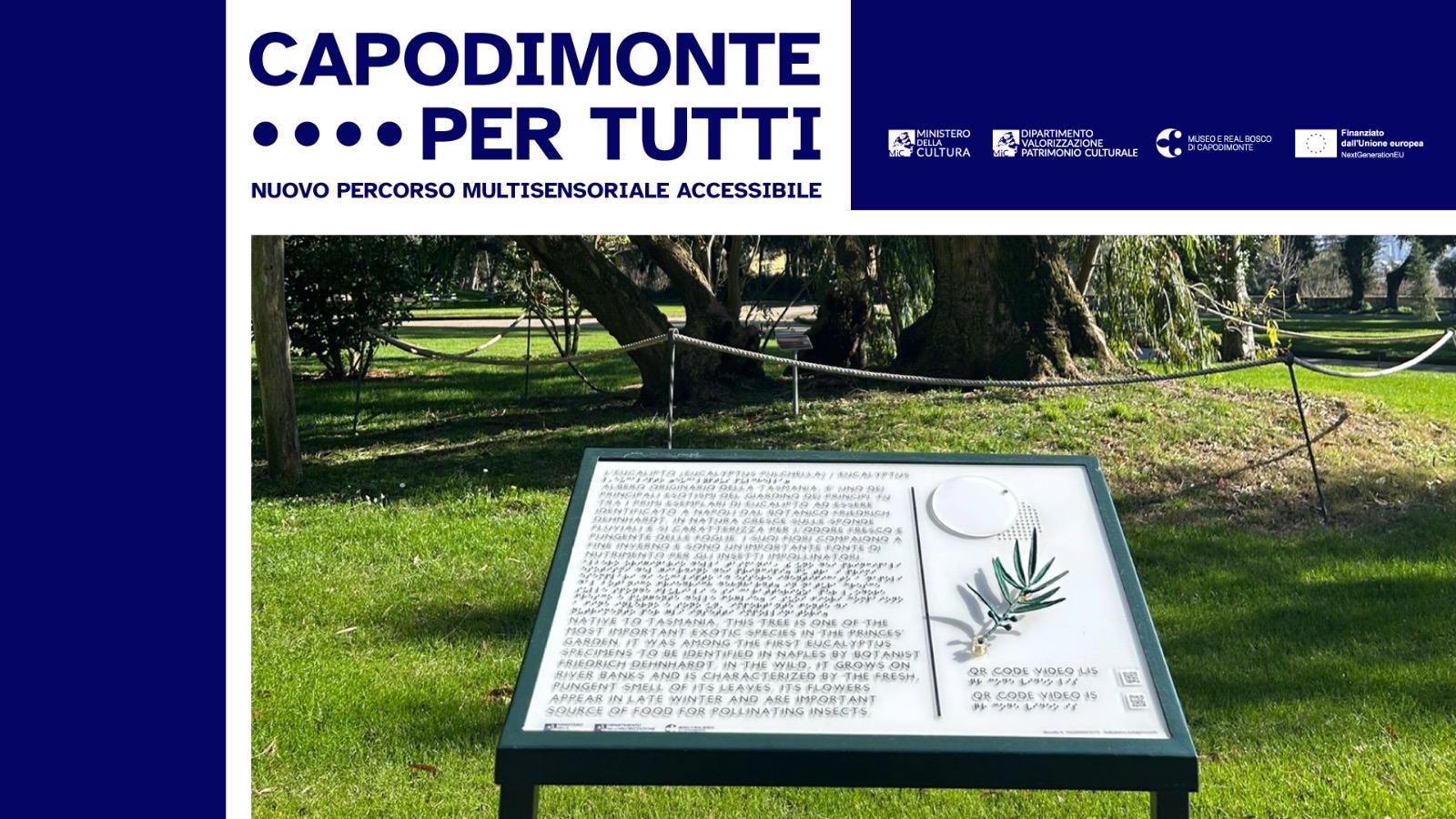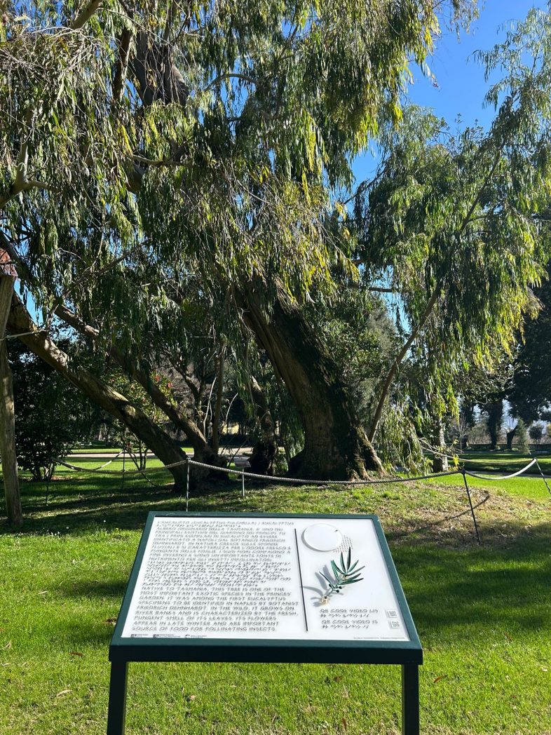Eucalipto – Descrive l’albero esotico, proveniente dalla Tasmania, censito tra gli alberi monumentali della regione Campania. Corredato di riproduzione in bronzo della foglia, qr code che rimanda al video LIS sulle specie vegetali di Capodimonte, e lo sportello per l’esperienza olfattiva dell’essenza.