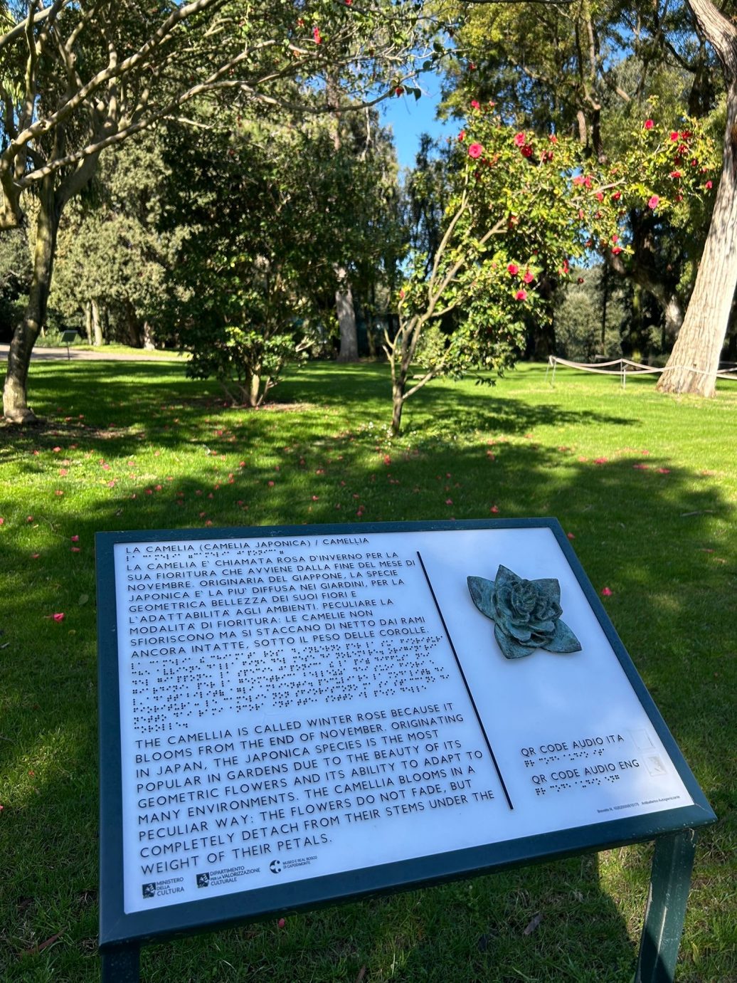 Camelia – Racconta dell’importanza del fiore nei giardini dei siti reali napoletani. Corredato di riproduzione in bronzo del fiore e qr code che rimanda all’audiodescrizione della camelia.