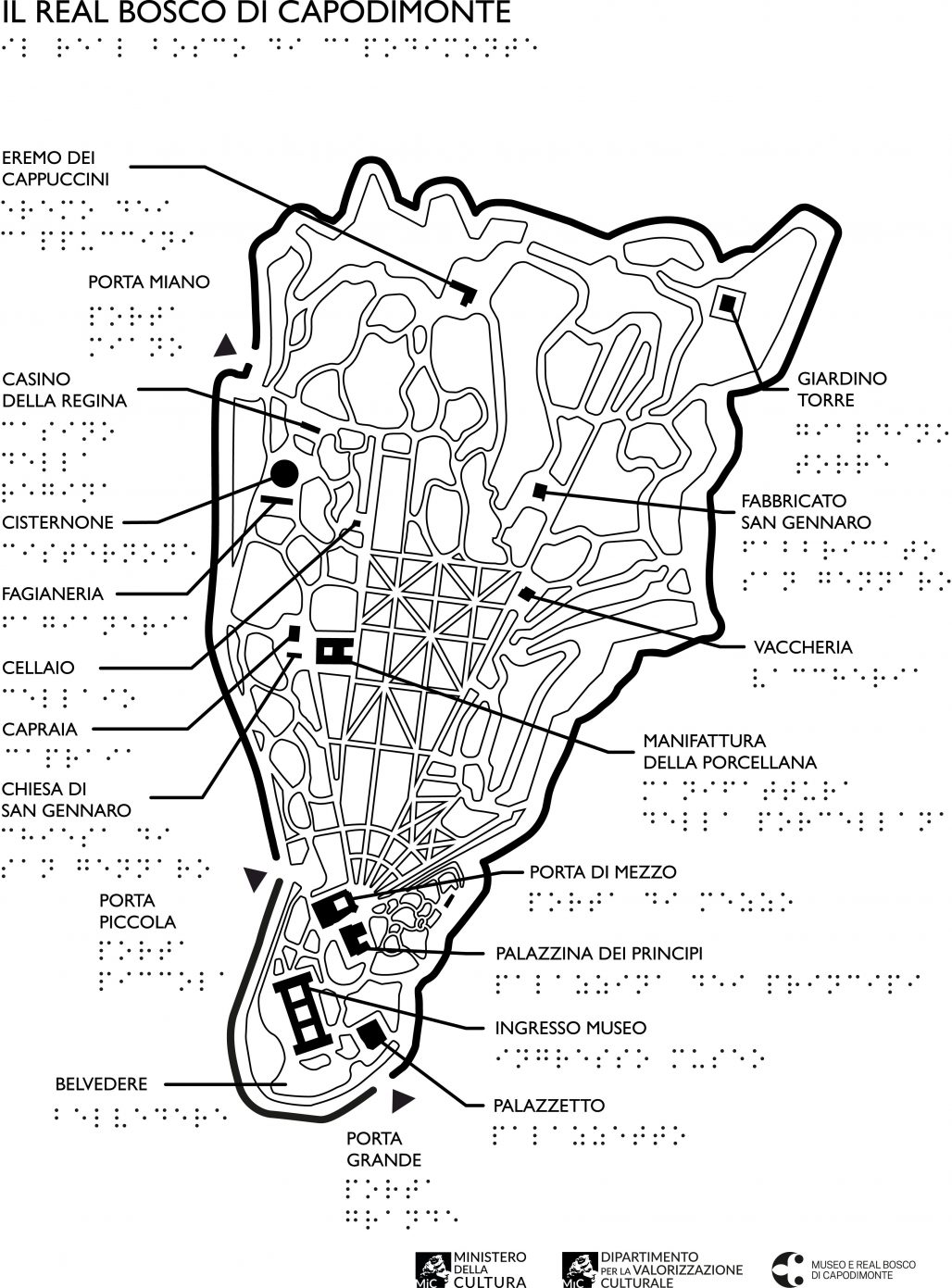 La Planimetria Schematica del percorso visita del Real bosco ne evidenzia gli elementi significativi. Realizzata in modalità compatibile con la tecnica stereocopy per la lettura tattile (grafica e testo nero e braille) risulta gradevole e comunicativa anche per la normale visione.